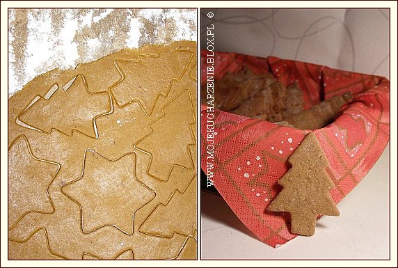 Ze schłodzonego ciasta formować lub wykrawać pierniki. Jeżeli używacie drewnianej foremki do speculaasów, należy ją obficie oprószyć mąką, następnie wcisnąć w nią porcję ciasta (ja kroiłam je na plasterki i wciskałam do formy), wytrząsnąć uformowanego piernika na blachę i odciąć nadmiar ciasta.
